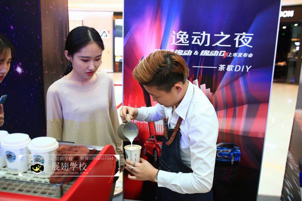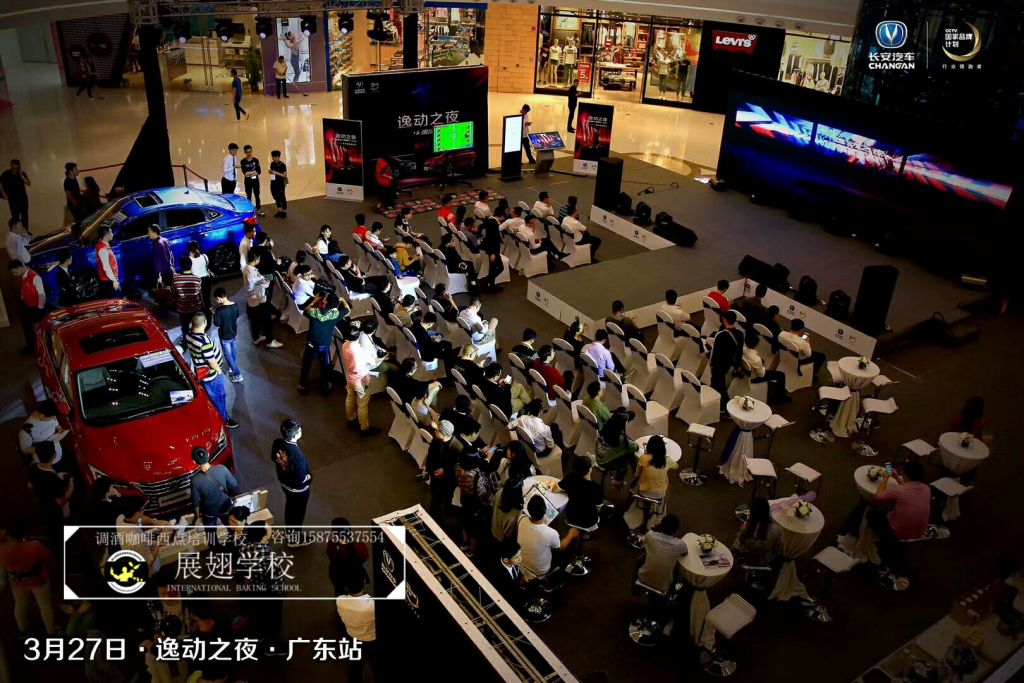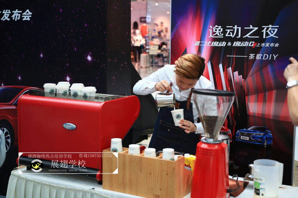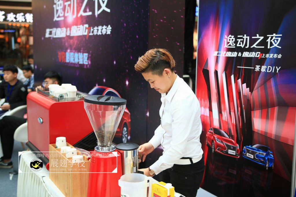 2018年3月27日,佛山展翅調酒咖啡西點培訓學校的咖啡學員受邀參加逸動之夜廣東站發布會。在現場的茶歇DIY環節,我們的咖啡師給現場的觀眾沖調咖啡飲料,并現場教學如何拉花,讓感興趣的朋友也可以體驗到咖啡的魅力和樂趣。