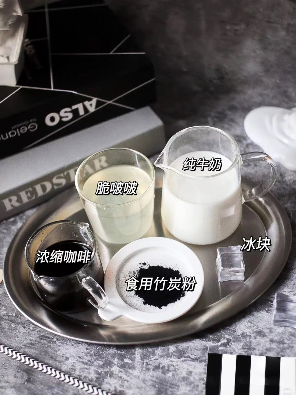 濃縮咖啡/食用竹炭粉/冰塊/純牛奶/脆啵啵